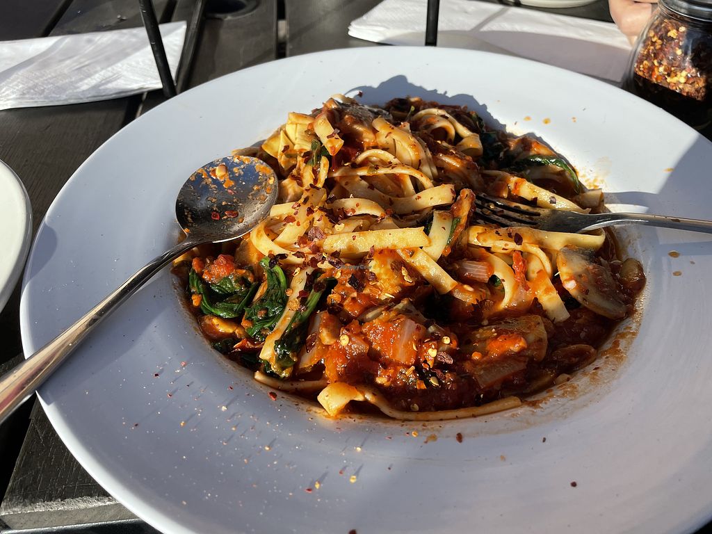 I came here w 2 and 4 legged friends and they were able to accommodate all of our needs. Italian food has dishes that are naturally vegan so I tried the pasta primavera and it was the best pasta that I’ve had in some time. Would definitely recommend!