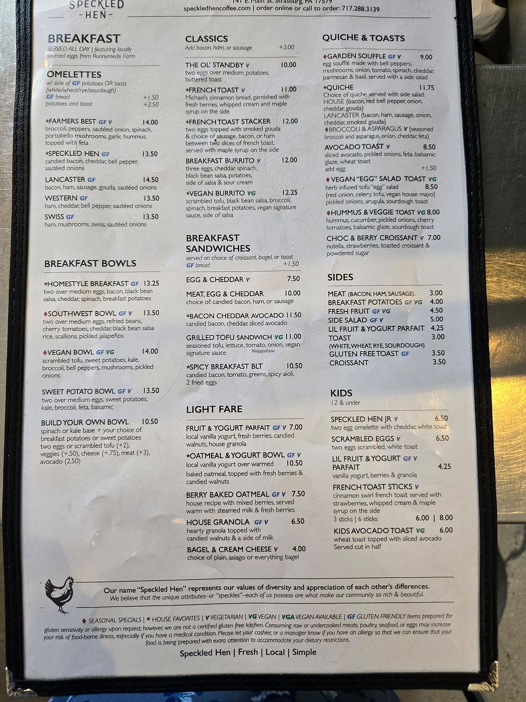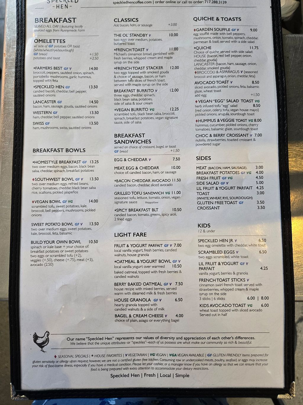 Speckled Hen serves meat, vegetarian and vegan food. The vegan options (yes many more than one) are delicious. We went twice while staying in the area and tried many different options. They were all delicious!!! Food comes out quickly. I will come back to this restaurant again.