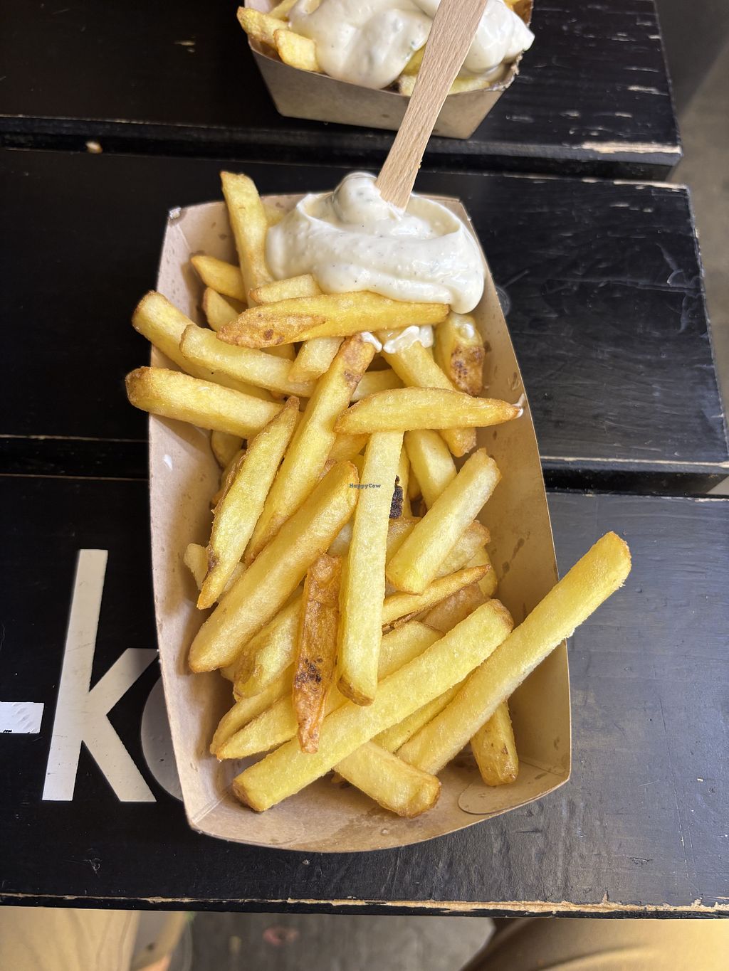 vegan bosna, fries with vegan truffle mayo & vegan kraut hot dog