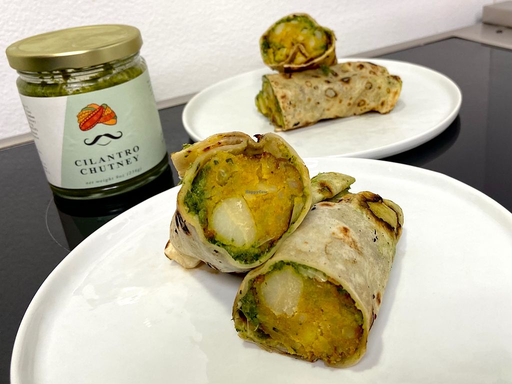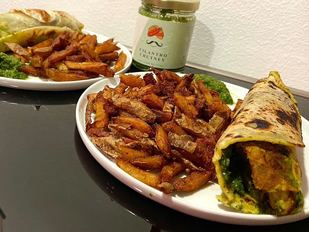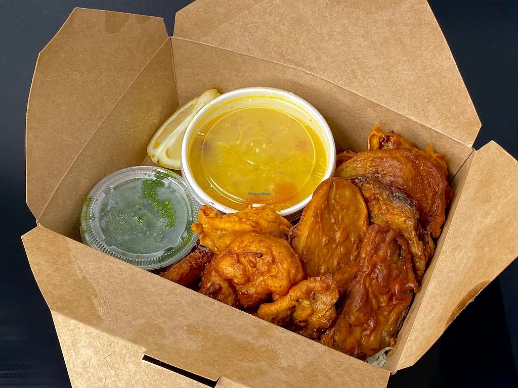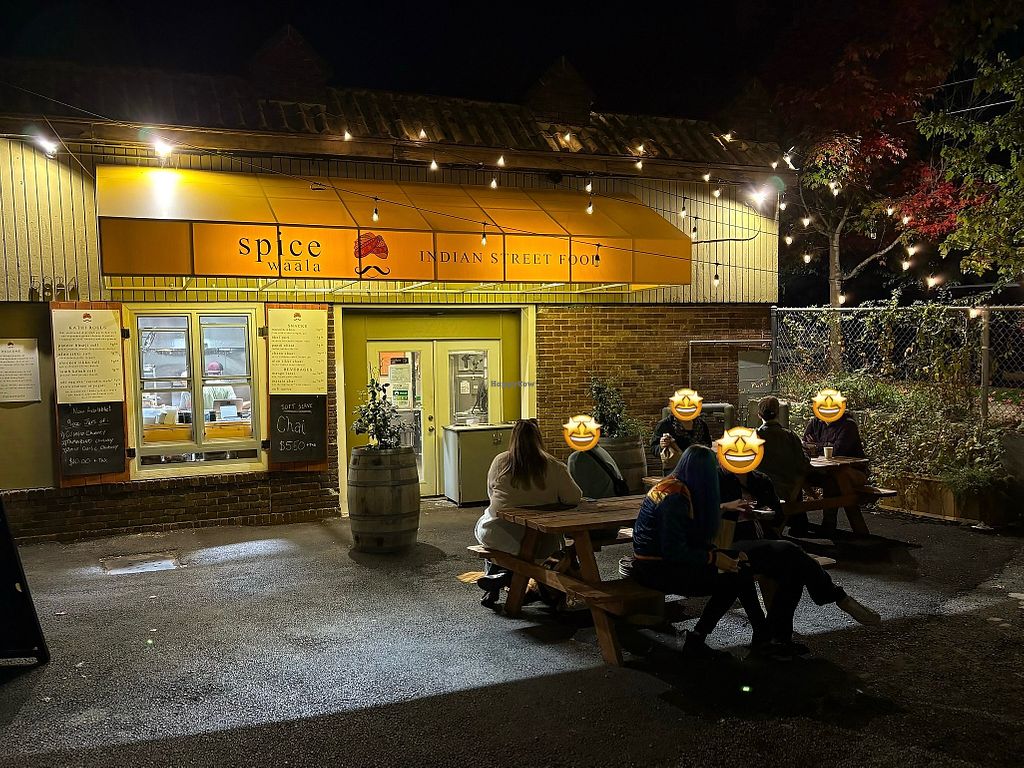 Serves meat, vegan options available. Indian street food take-out window. Vegan offerings include an aloo tikki kathi roll, bhel puri, chana chaat, and masala fries. One of several locations. Open Tue-Sat 5:00pm-9:00pm. Closed Sun-Mon.