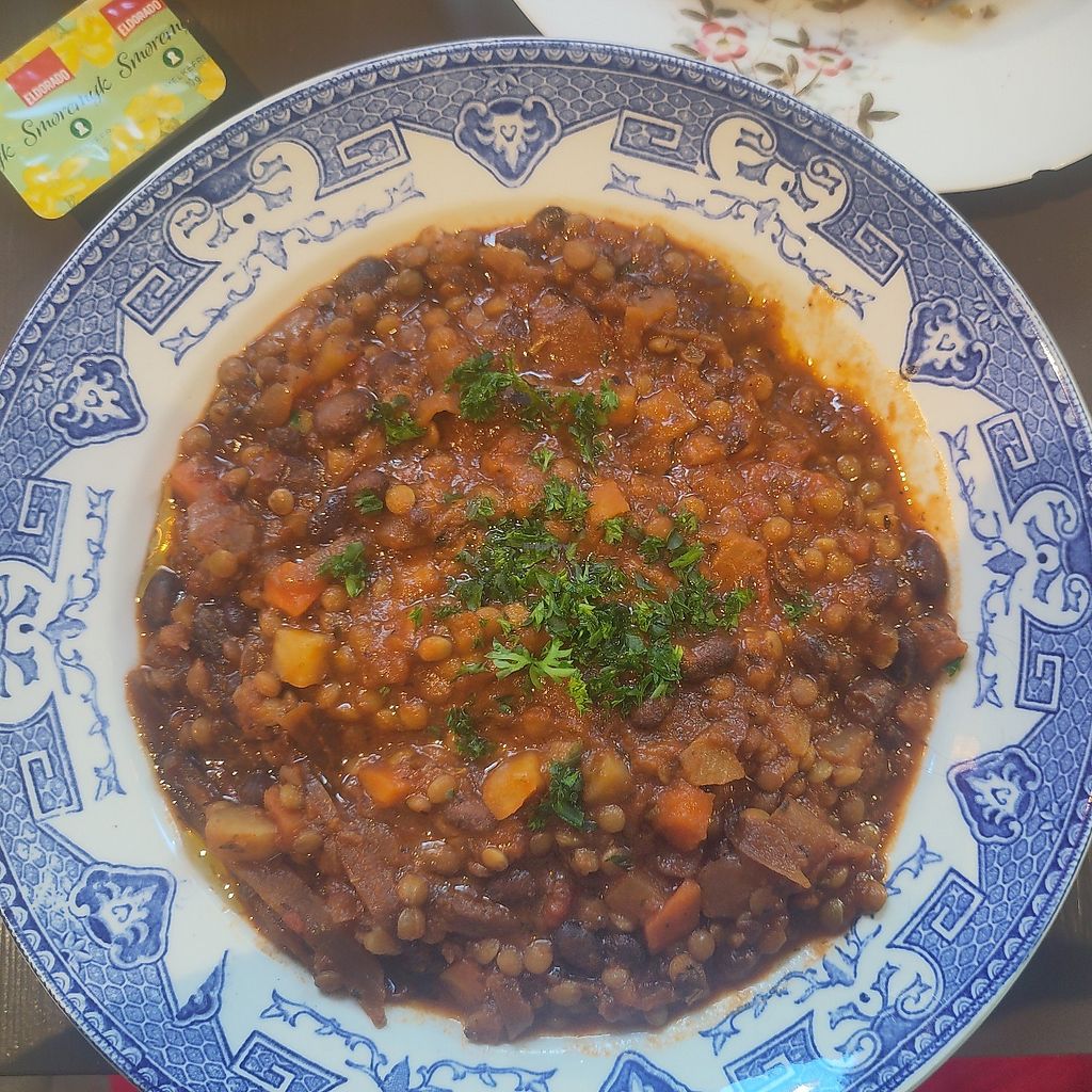 Serves meat, vegan options available. Restaurant and café with vegan food options marked on the menu, including a lentil and bean stew. Vegan butter is available for the bread. Open Mon-Sun 8:00am-11:00pm. Kitchen closes at 21:00 except for Monday, then it closes at 15:00.