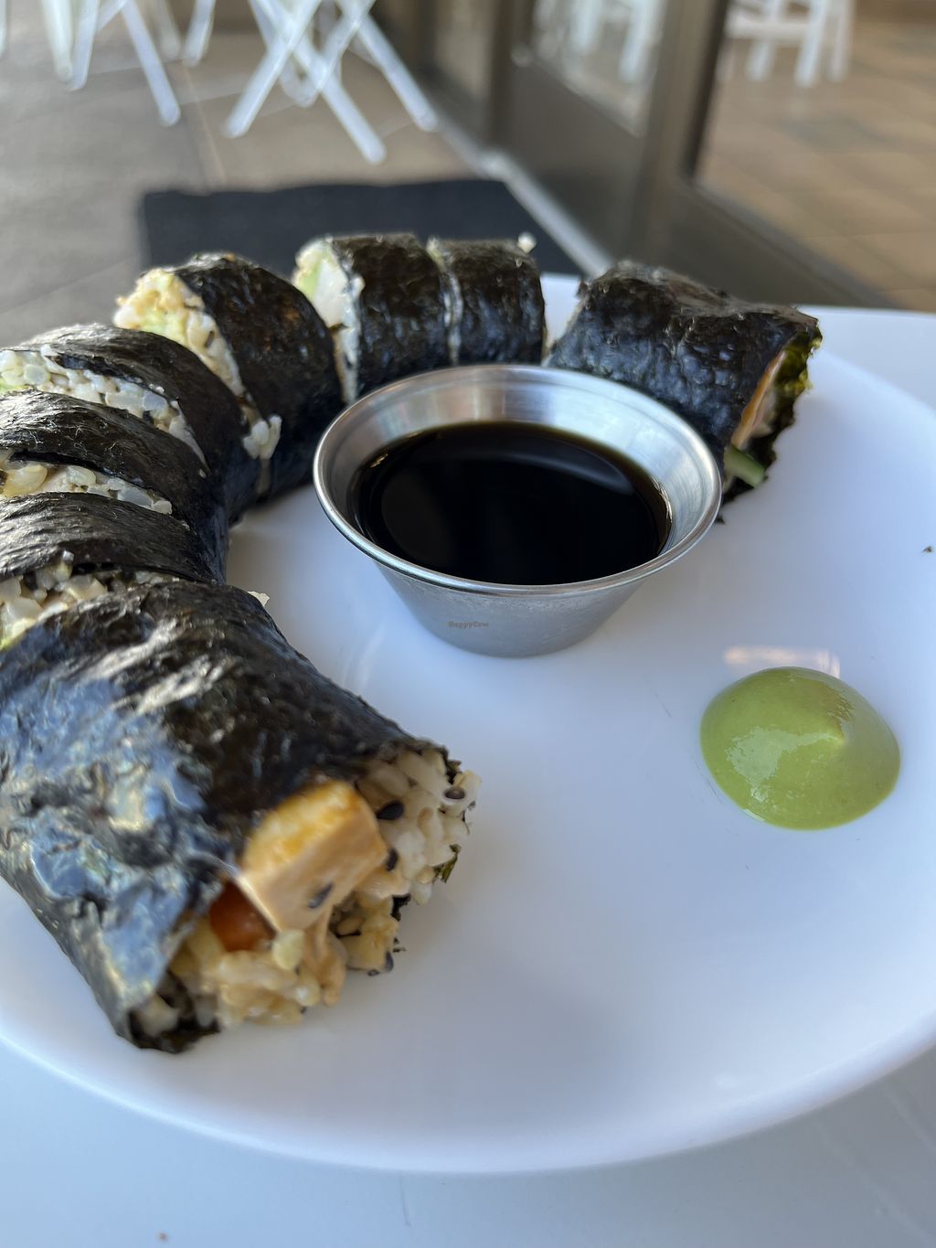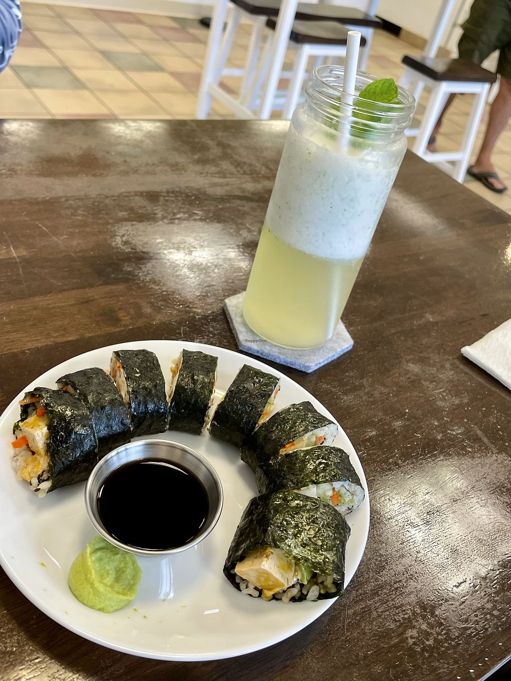 Spicy tofu “sushi” and aloe slush