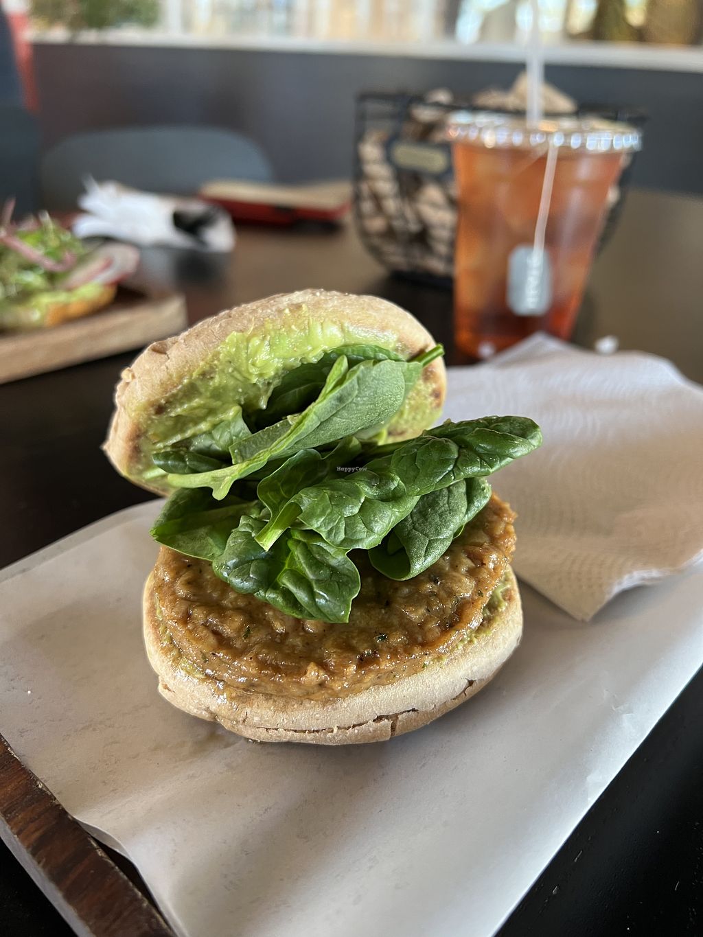I enjoyed the breakfast sandwich…an English muffin with spinach, avocado, and a vegan breakfast patty… I also ordered the mango ice tea.