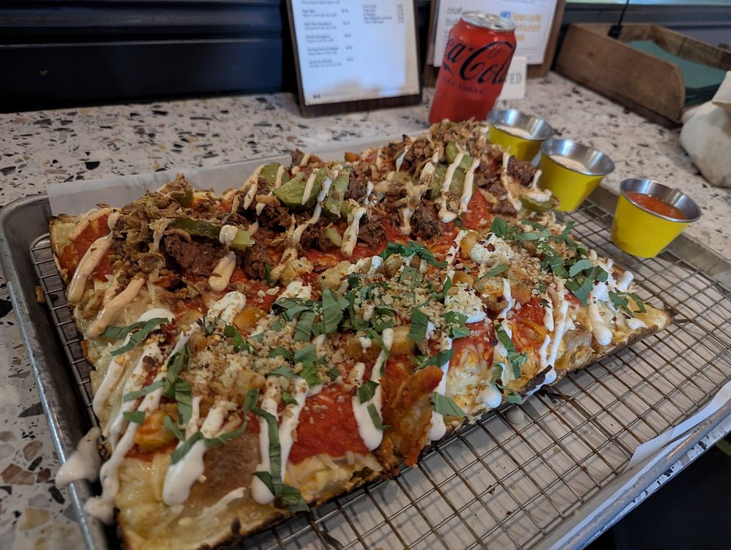 Serves meat, vegan options available. Offers traditional Detriot style pizza including a vegan pizza with vegan cheese. Has vegan crust dips. Also has selection of vegan soft drinks and craft beers. Open Mon-Tue 11:30-21:00, Wed 12:00-21:00, Thu-Sat 12:00-22:00, Sun 12:00-20:00.