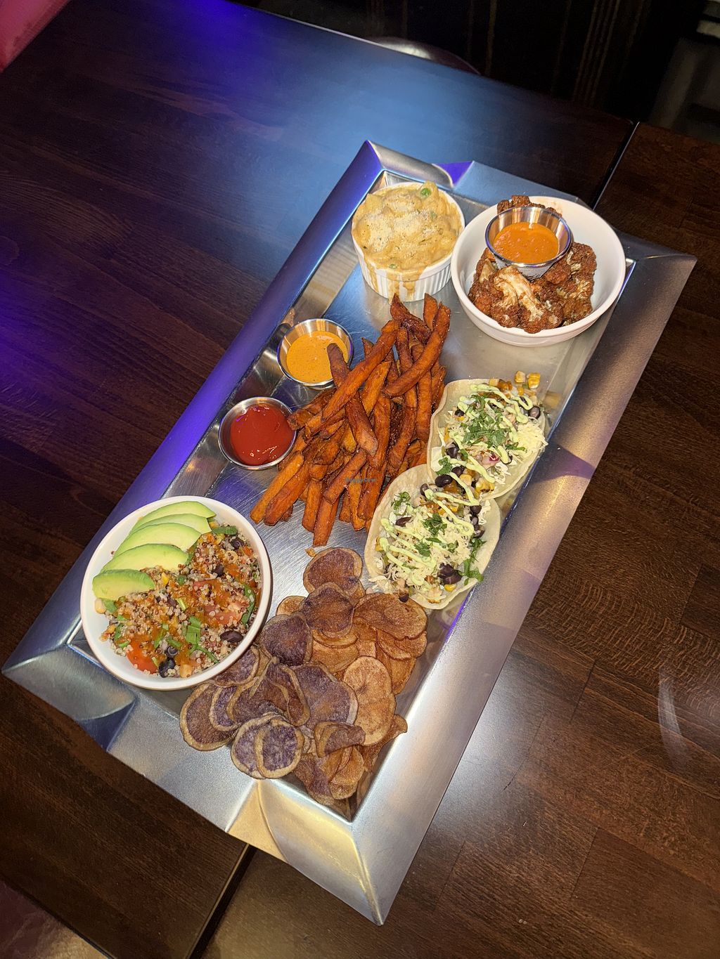 The menu surprising has quite a few vegan options. I got the whole vegan platter, which I was able to try a few things out. The Mac and cheese is so good. Another time I got the vegan burger, sweet potato fries, and Mac and cheese but forgot to take a photo because it was so delicious. The vibe inside is a speakeasy lounge type. Perfect for date night or girls night.