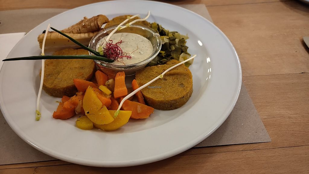 Pumpkin and corn patties with za'atar, harissa and ras el hanout, serv…