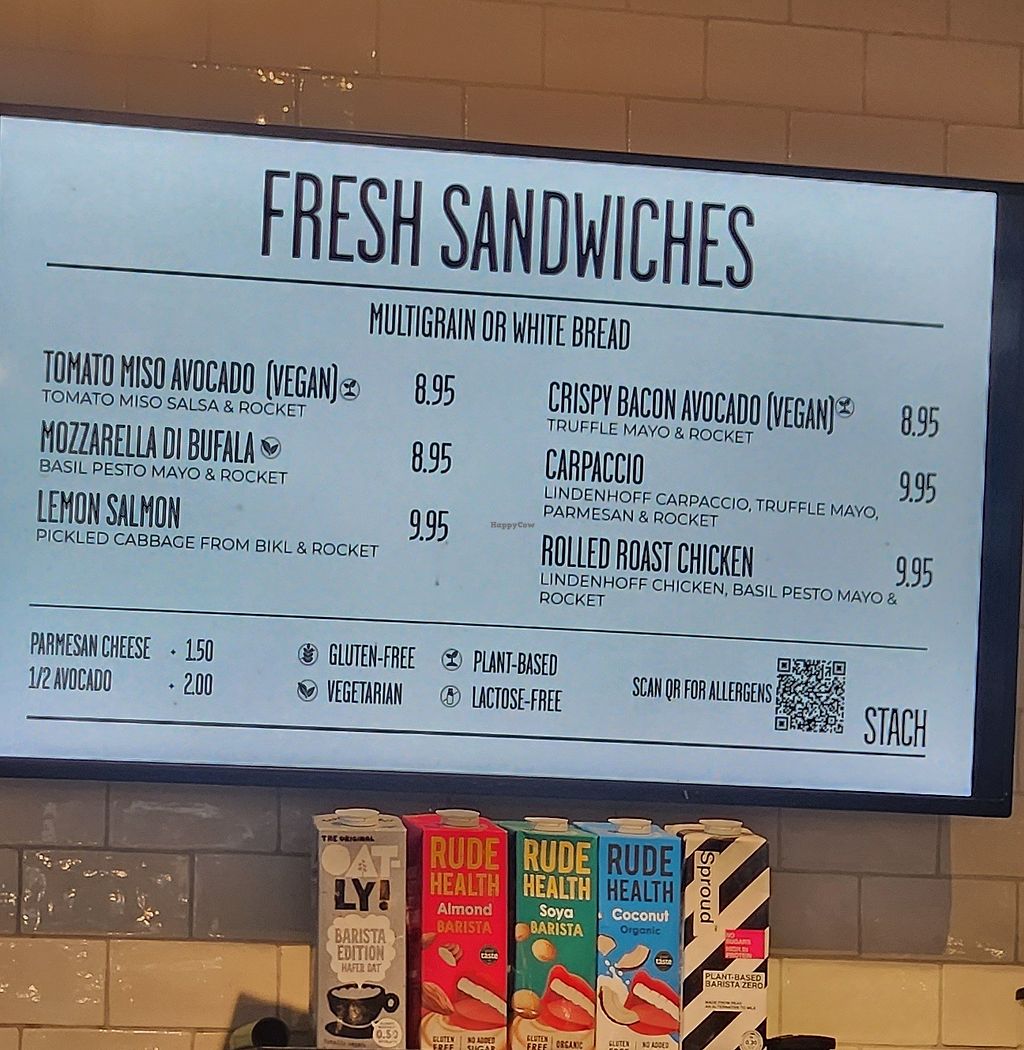 Lots of vegan options: three types of vegan hot chocolate, 5 types of vegan milk, vegan protein bars and other sweets and VEGAN STROOPWAFELS. ❤️ it’s also the only place on this airport where I found matcha latte ❤️ they also serve some sandwiches and bowls