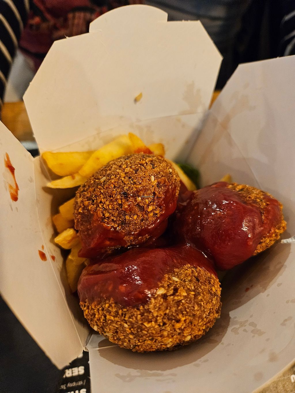 Bar is in the building of old railway station. The staff is friendly and helpful. There should be more plant based souces. There was only ketchup and spicy one.