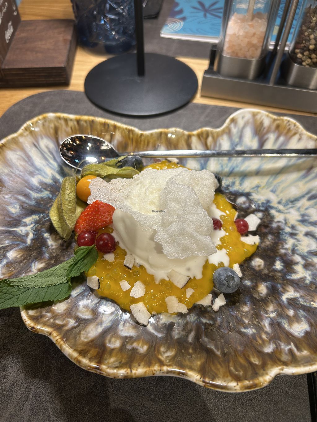 Es gibt vegane Vor- Haupt- und Nachspeisen. Etwas teuer (Tofu Topping 5 Euro) aber sehr lecker.