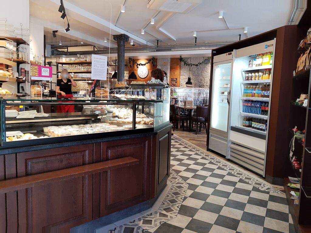 Für Kaffe kann man Kuhmilch auf Anfrage mit Sojamilch wechseln. Das Gebäck ist allerdings nicht vegan.