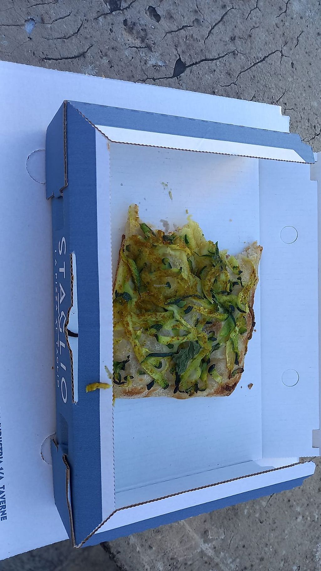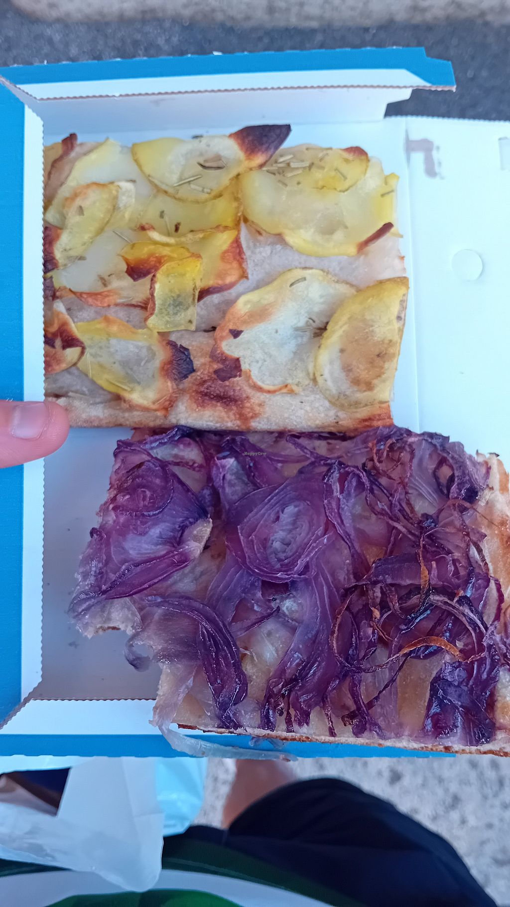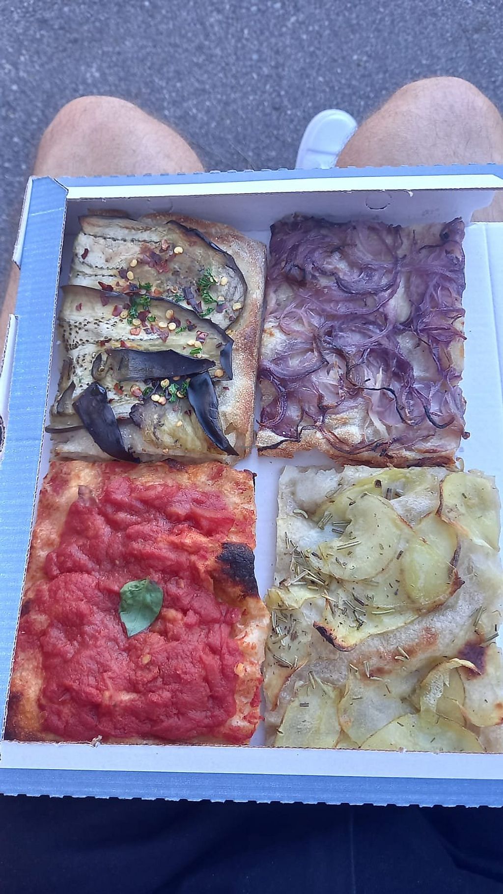 Take-out focaccia with vegan toppings: curry zucchini, aubergine, onion, tomatoes, classic marinara and some more.