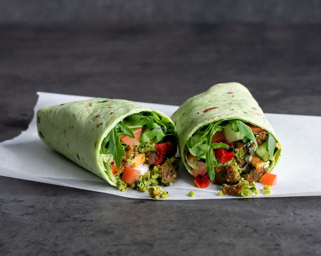 Falafel Wrap - Green chickpea falafel, roasted peppers, tzatziki, arug…