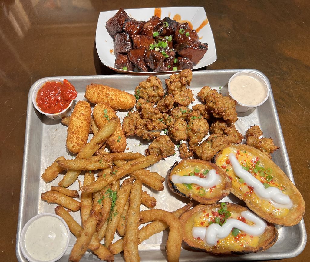 Sampler with pickle fries, tater skins, Mozzarella sticks, popcorn chi…