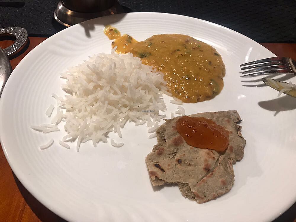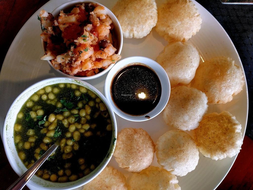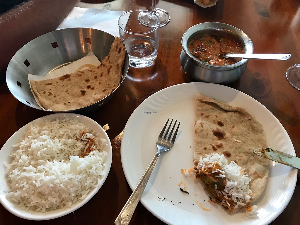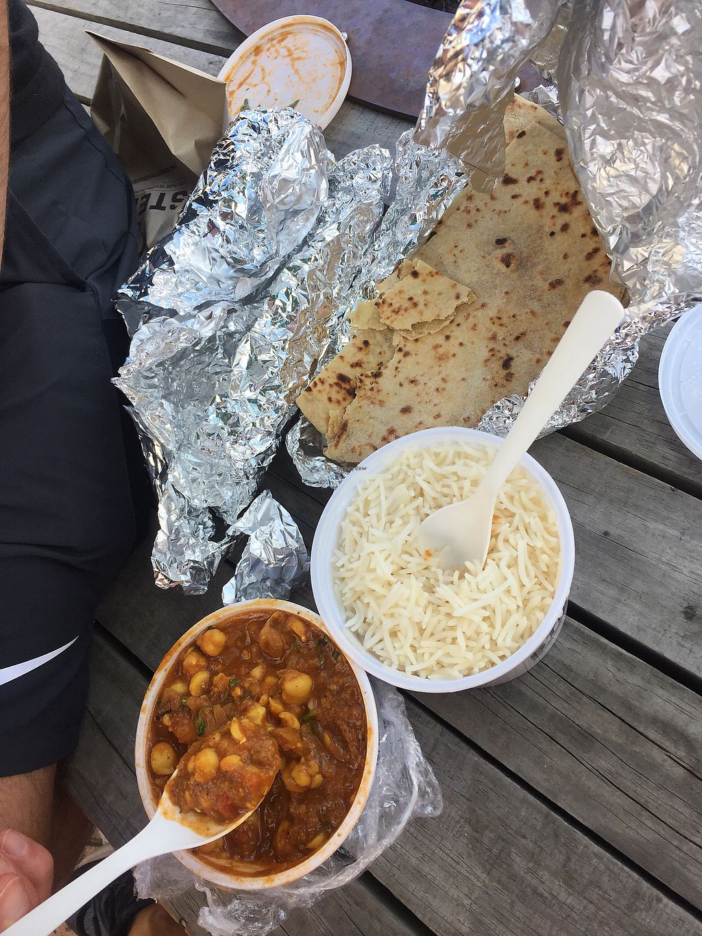 Samosa chaat (top left), aloo gobi (bottom), and rice