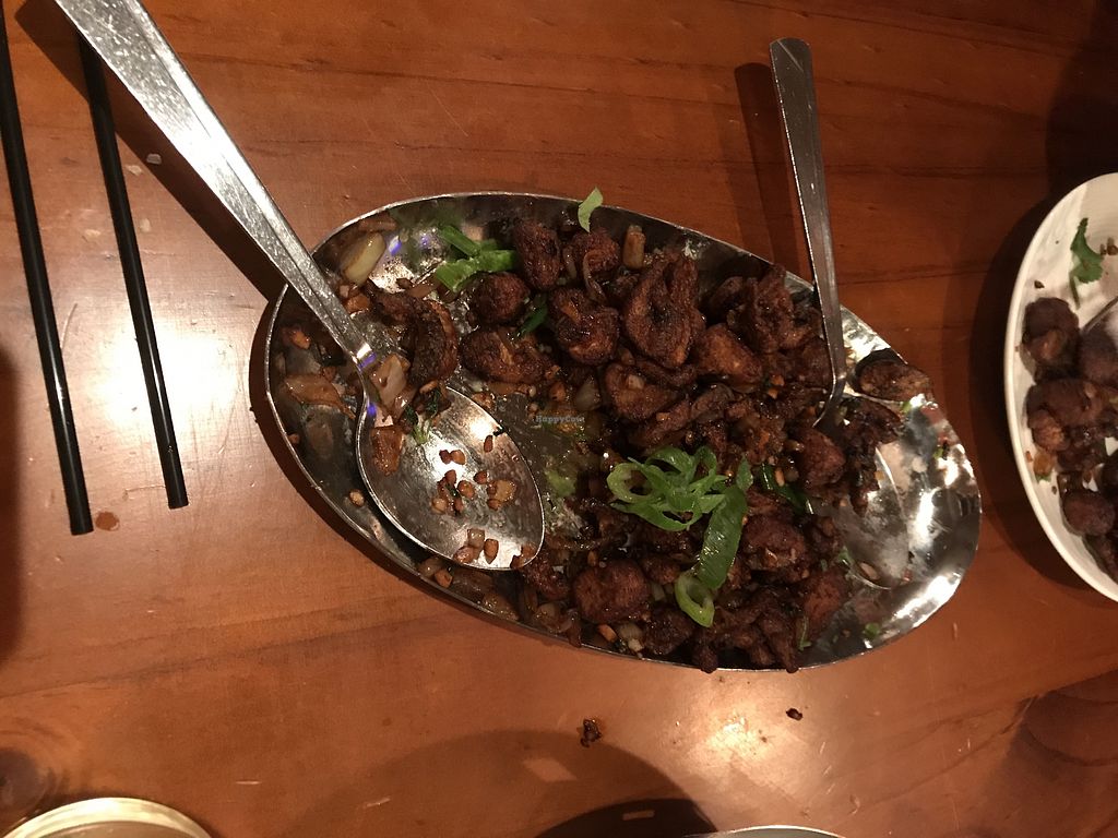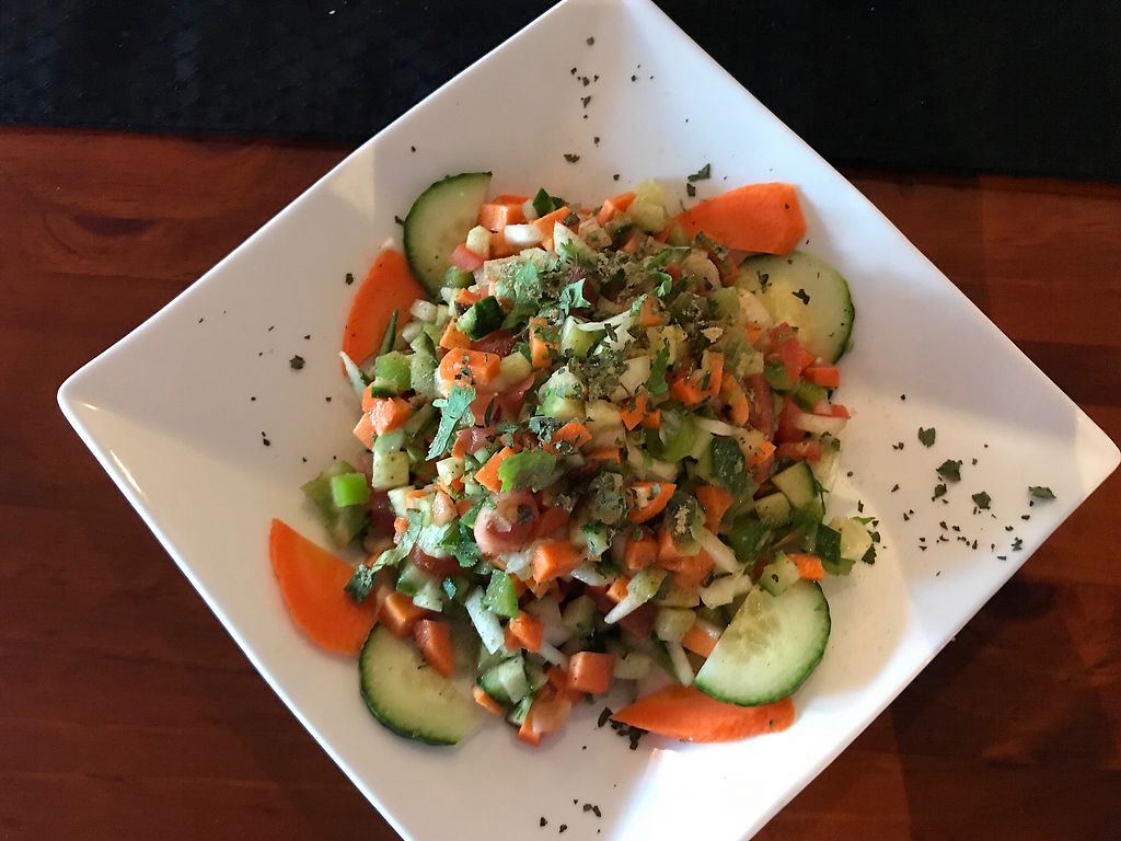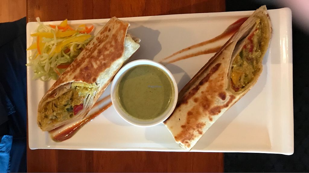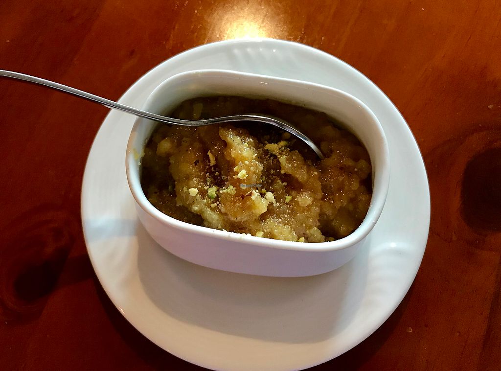 Samosa chaat (top left), aloo gobi (bottom), and rice