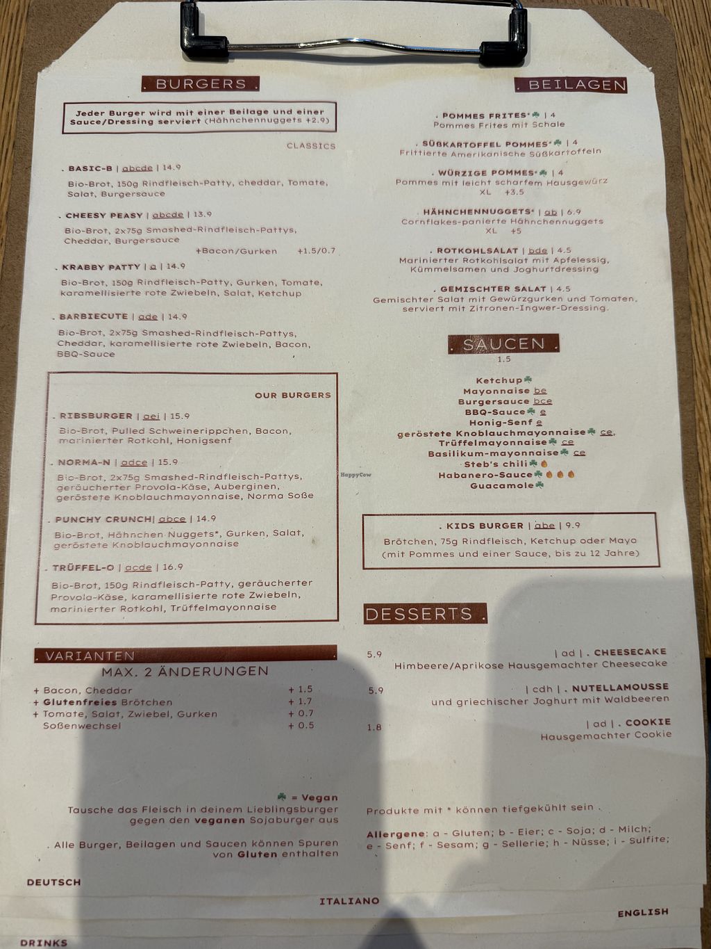 Jeder Burger kann mit veganem Patty bestellt werden, dadurch sind einige Burger vegan. Auch eine gute Auswahl von Dips und Beilagen in vegan.