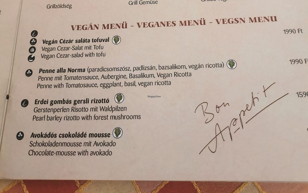 They have a dedicated page in the menu for vegan options, including pesto gnocchi, penne alla norma, chilli sin carne, Caesar salad with tofu, and coconut cream panna cotta. The vegan options are also highlighted on the chalkboards on the wall. The servers are super kind and accommodating, and delivery within Tihany is free and very quick. Fully recommend this restaurant!