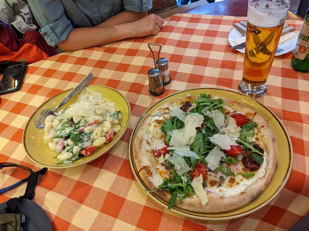 We had the pizza with vegan cheese and pesto gnocchi, we liked it. Nice staff.