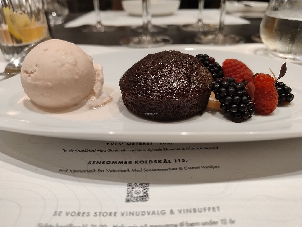 Desserten var chokoladekage med rabarber sorbet og friske bær.