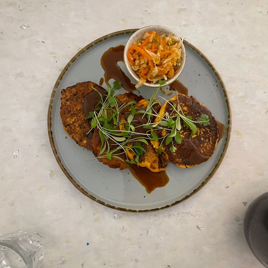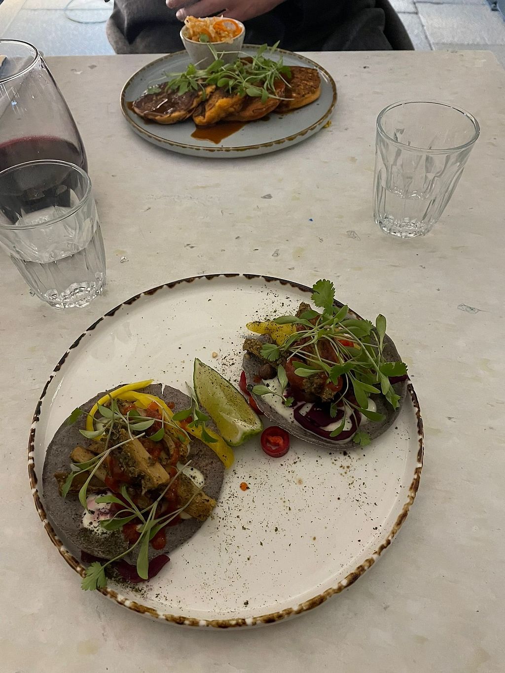 Starter - blue corn taco shells filled with crispy king oyster mushrooβ¦