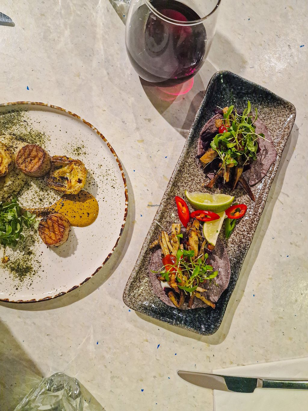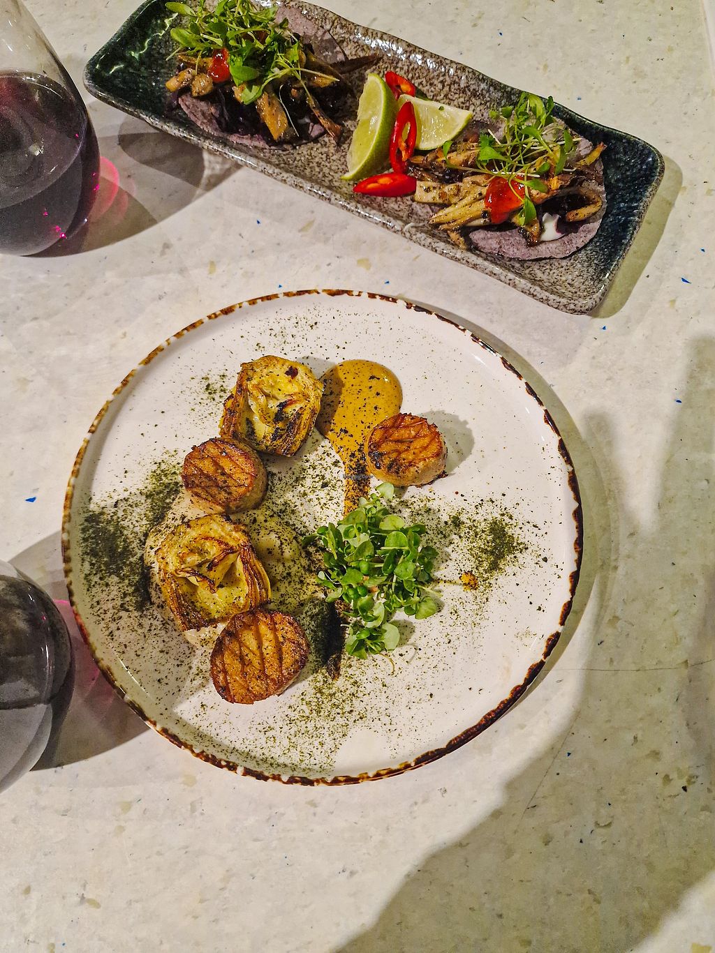 Starter - grilled king oyster βscallopsβ & artichoke hearts on cauliflβ¦