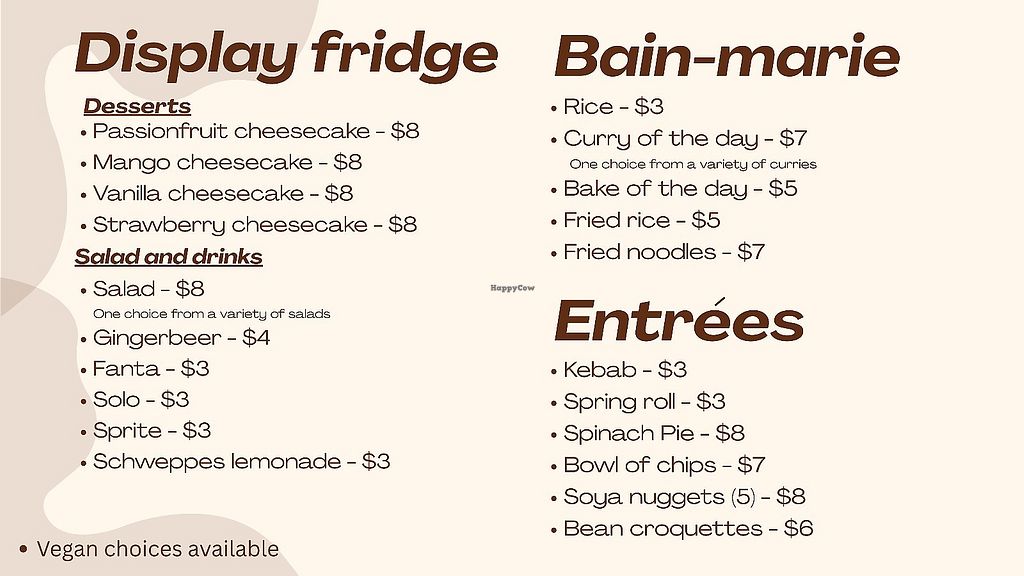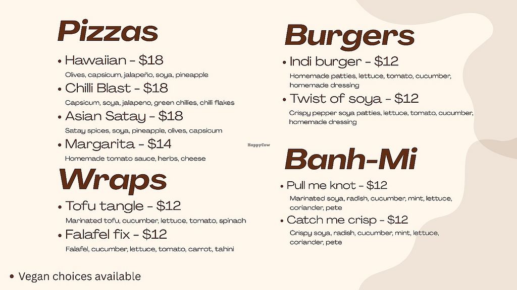 Vegetarian restaurant with items that can be made vegan such as pizza, wraps, banh mi, laksa, fried noodles, fried rice, samosas and more. Open Mon-Sat 12:00pm-8:30pm. Closed Sun.