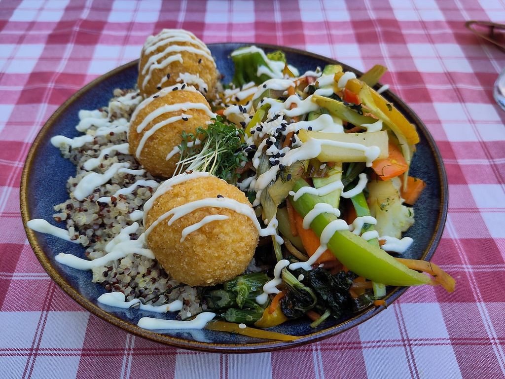 *BIO-Gemüse Bowl mit Quinoa, Hirsebällchen und Wasabimayonnaise