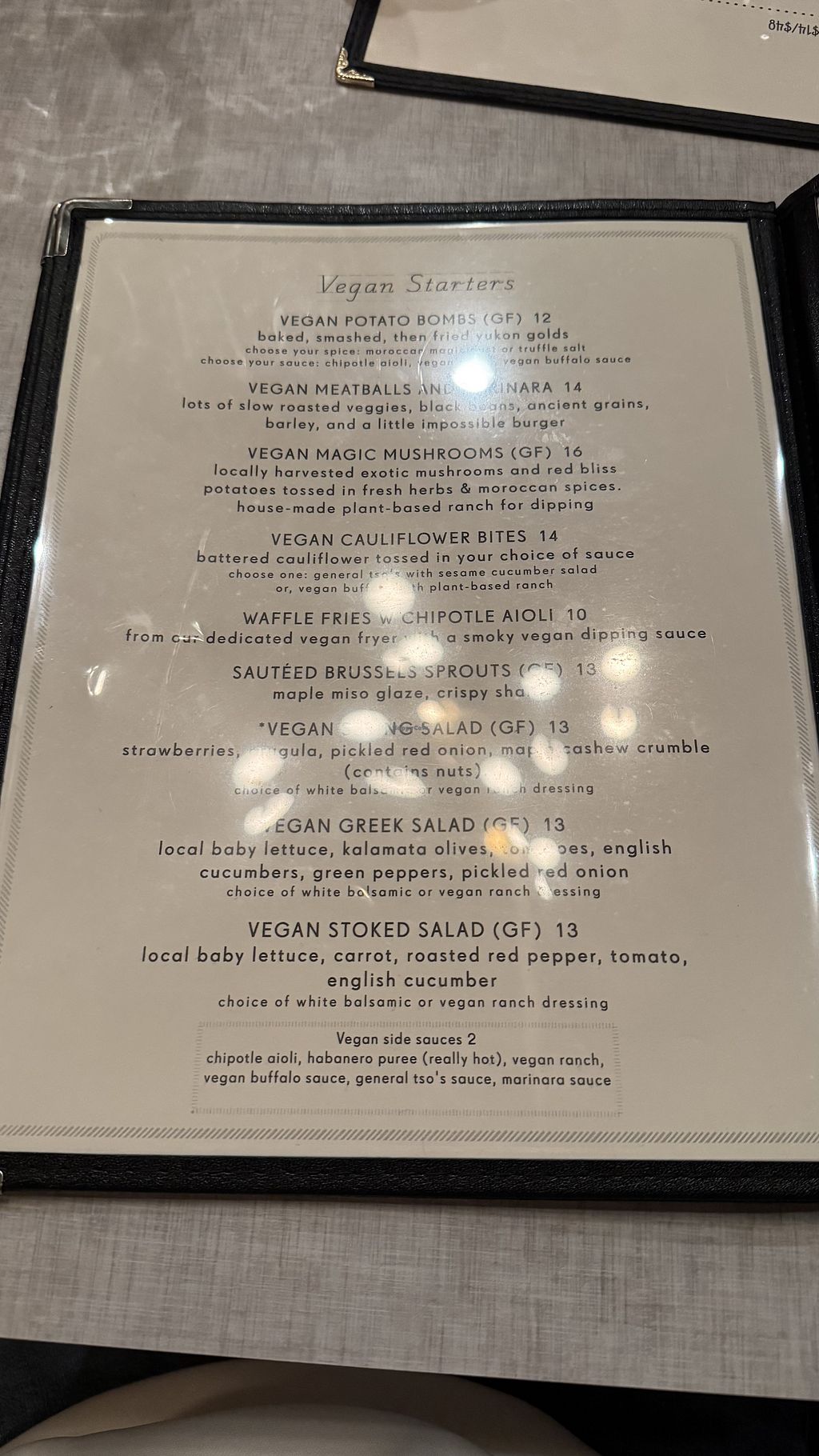 New-ish vegan and was wary of trying vegan pizza but really enjoyed Stoked Pizza. Had General Tso's Cauliflower Bites to start which were delicious (although spicy). Ordered the vegan meatball pizza which was great and was blown away by the impossible cheeseburger pizza. They had a whole vegan menu with tons of options that had clear descriptions. Did not order dessert but they kindly included vegan caramels with the check :).