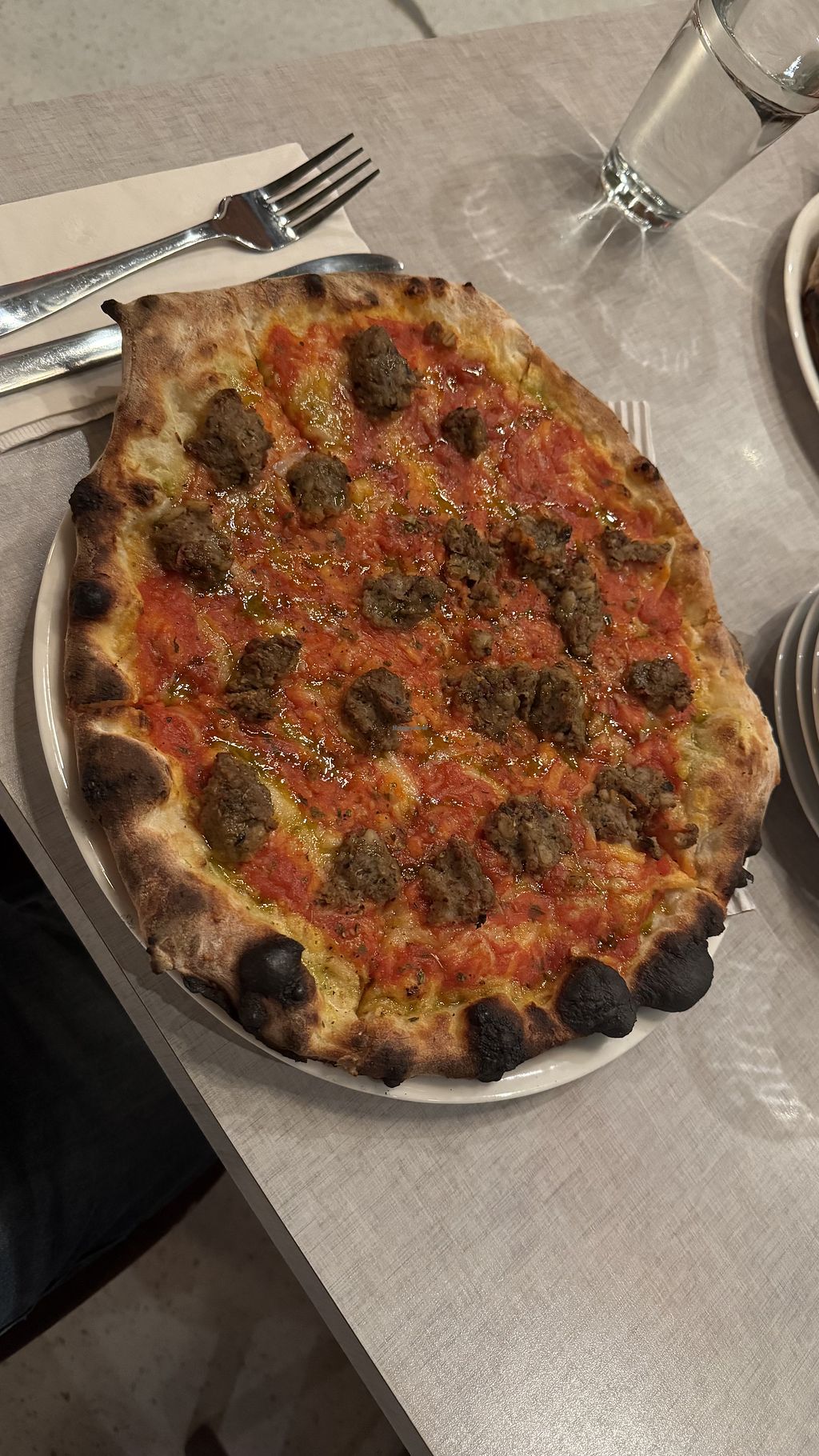 The service was great! The crust can really make a pizza, and this one really did. So flavorful! There is a separate fully vegan menu. We got a meatball pizza and an onion and mushroom pizza. Both great! Not the best in the world, but great! The mushroom appetizer was okay. It had a little too much tang for our taste.