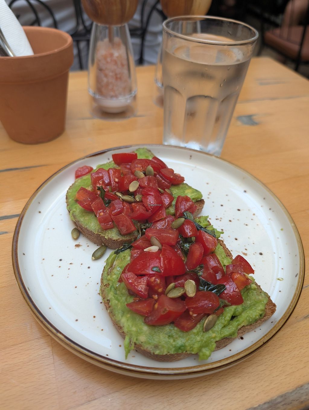 The cafe offers charming indoor seating and a pleasant shaded outdoor area. We tried two different toasts: one with avocado and tomato, and the other with avocado and almonds. Both were delightful, though they were more like light snacks than filling breakfast. While the menu doesn’t explicitly list vegan options, many vegetarian dishes can be made vegan—just ask the waiter. The coffee was good, and they offer almond milk, though it comes with an extra charge, which is a downside.