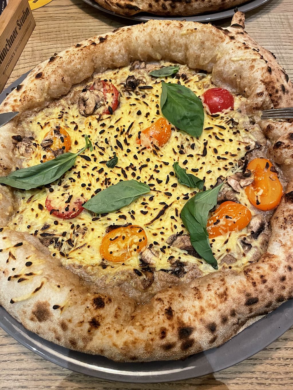 A traditional Bavarian inn that offers Neapolitan pizzas in addition to hearty German cuisine. They have a decent selection of vegan pizzas. I didn't have to look at the menu for long and opted for the Piemontese Vegan (€19.50) with truffle, vegan cheese, mushrooms, and cherry tomatoes. The dough was, as expected with this type of pizza, fantastic. However, the topping was incredibly greasy. On top of the thick cream with truffle was another thick layer of vegan cheese, plus oil. That was really too much for me. Unfortunately, the server wasn't particularly friendly either. I might try one of the other vegan pizzas, which are also significantly cheaper, on another visit.