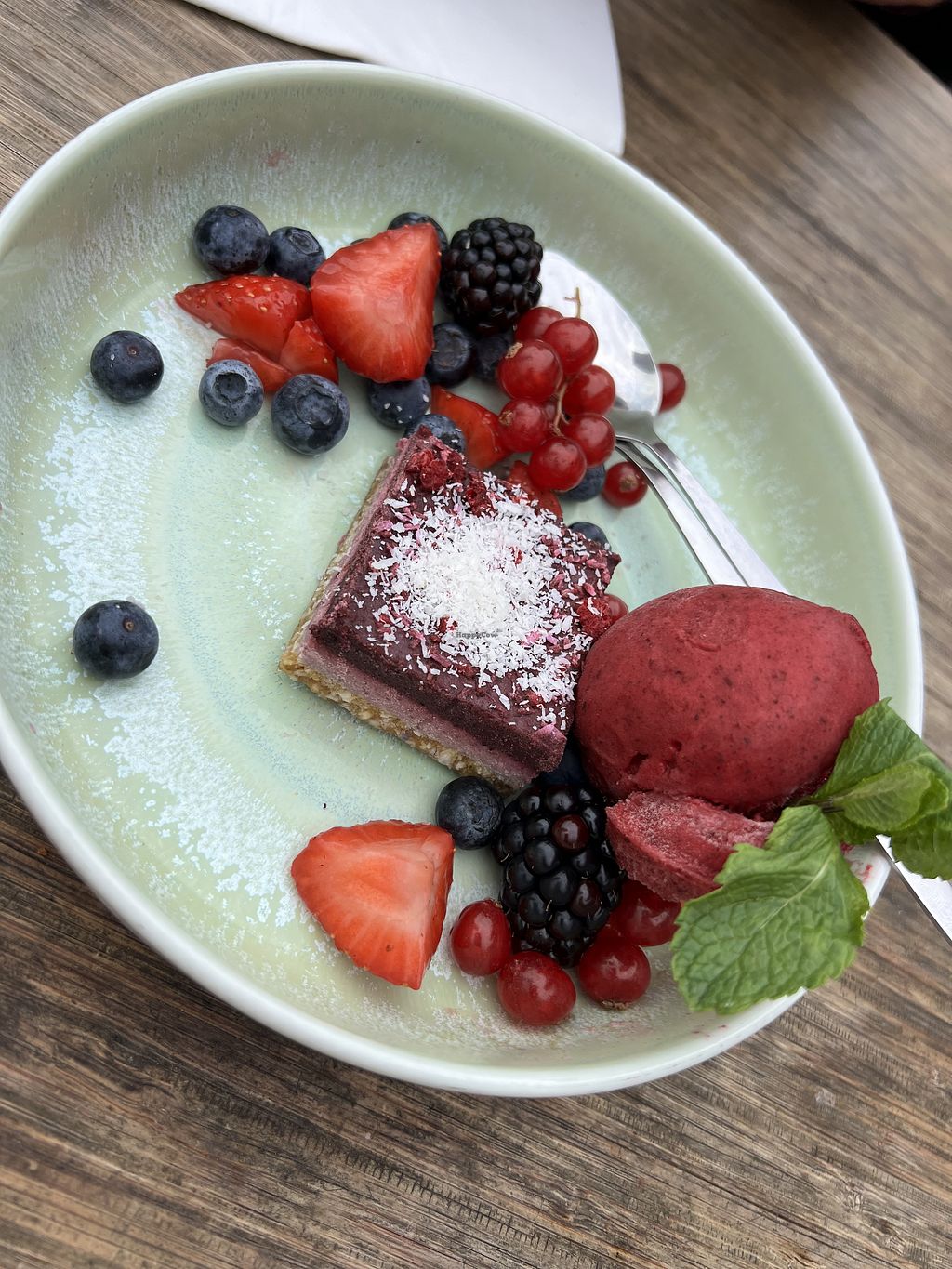 Koffie met havermelk en een super lekker dessertje met rood fruit en bolletje casisijs
