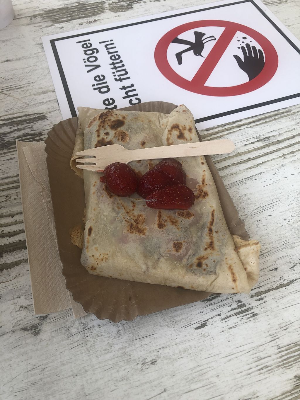 Serves meat, vegan options available. Eatery that can make the sweet crepes vegan by using fruit and other plant-based toppings like sugar & cinnamon, vegan Nutella, apple sauce, vanilla, and marzipan. Has vegan alcoholic drinks, plant milk for coffee. Food is served on paper plates and wooden forks. Open Mon-Sun 11:00-19:00.
