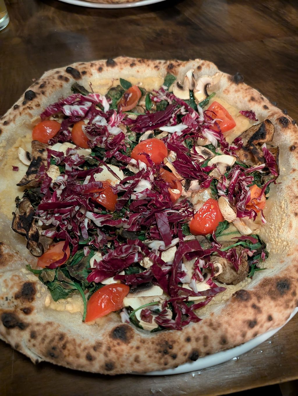 I had the vegan pizza. The base is made with chickpea so don’t expect that it’ll taste like cheese, but it’s very good! It tastes like Italian farinata, if you like chickpeas you’ll love it. Vegetable on top are tasty, both cooked and raw.