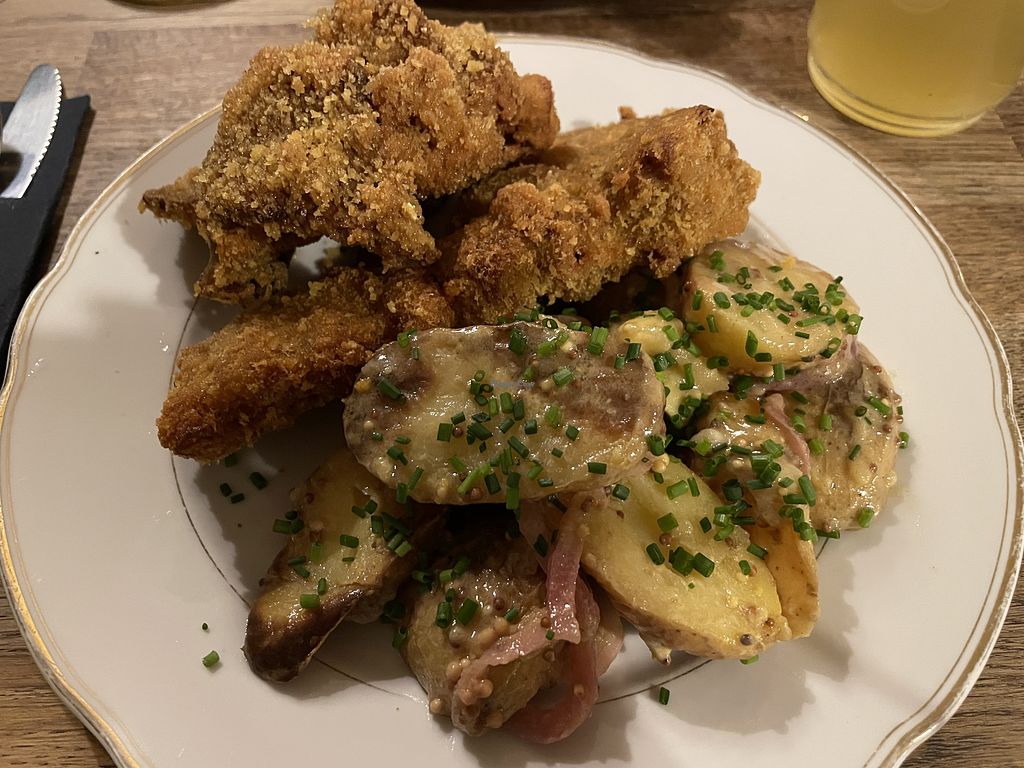 We got the schnitzel w/ potato salad, cheese board and the red cabbage dumpling. It was good and hearty, but found it one note.