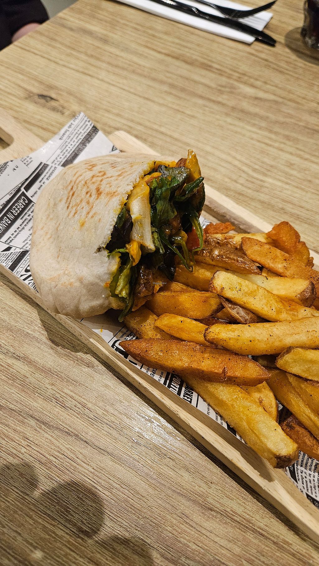 Shawarma pita sandwich with veggie meat in tahini and mango sauce!