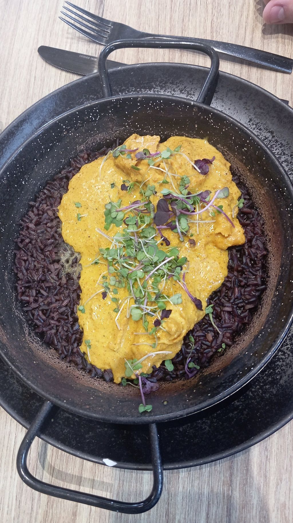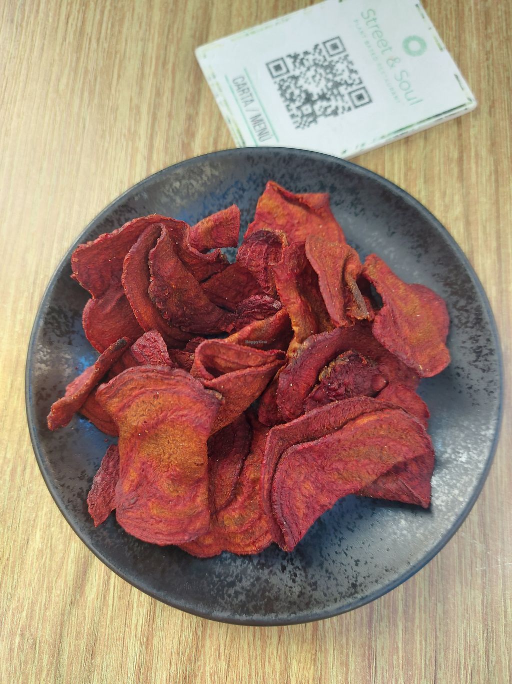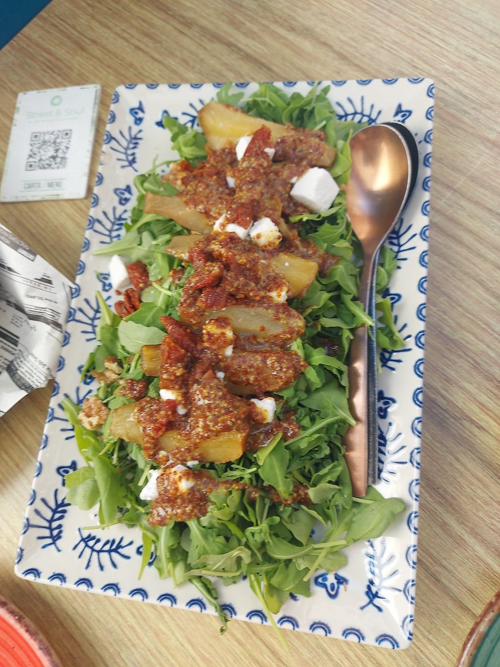 Ensala de peras, queso feta vegano, nueces, mostaza y tomates secos