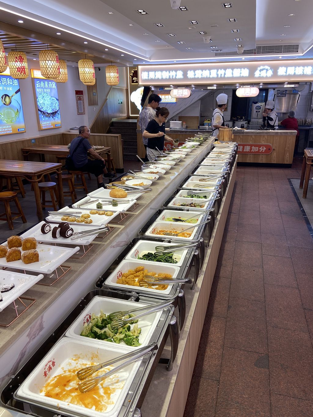 We got here about 5pm (I was warned it gets super busy but it was fine at that time ), and for 23¥ were offered the all-you-can-eat veggie buffet. There’s a wide range on offer, including desserts and soft drinks, and the dumplings, roasted pumpkin, and noodles with green beans were really good. Actually, I tried a lot of dishes, and they were all pretty tasty.