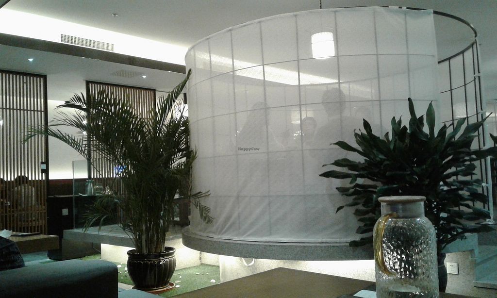 High-end restaurant serving vegan cuisine. Features enclosed dining booths as well as open tables. Menu has both Chinese and English. Offerings include Chinese specialties of various styles, dishes that highlight just one or two vegetables, lavish desserts, mock meats, and a few western style items such as pizza. Teas, plant milks, juices, and beers available. Reported closed May 2025.