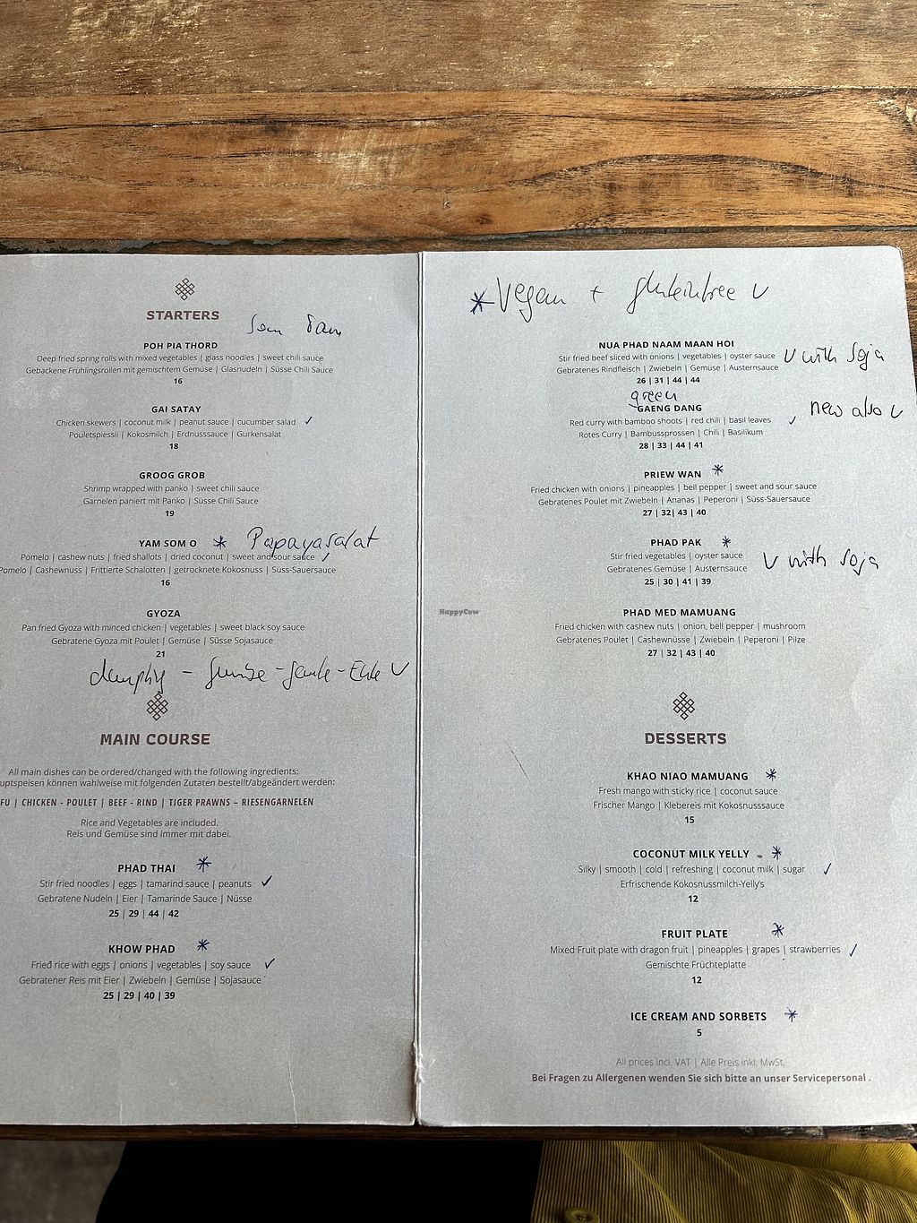 Auf Nachfrage hin, hat man mir eine separate Karte gebracht, wo die veganen Optionen mit einem Stern markiert waren. Aber auch auf der „normalen“ Karte gibt es veganes Essen (z.B. die Gemüse-Dumplings). Es war ziemlich klar, dass nicht häufig konkret nach rein veganem Essen gefragt wird. Das Personal war jedoch sehr freundlich & hilfsbereit.