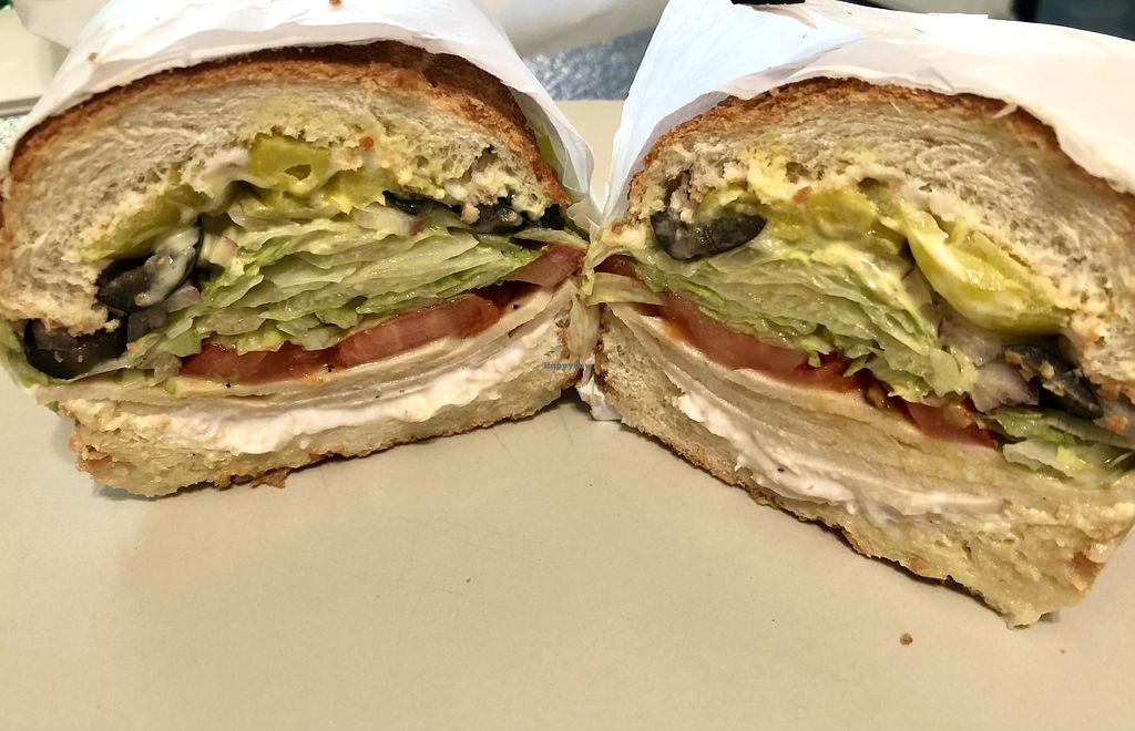 Vegan Turkey Sub stacked with vegan provolone, black olives, lettuce, …