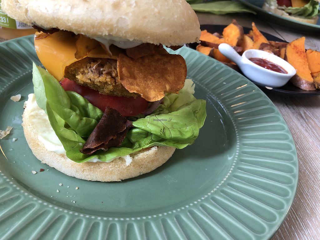 Crispy Jackfruitburger; Süßkartoffelecken