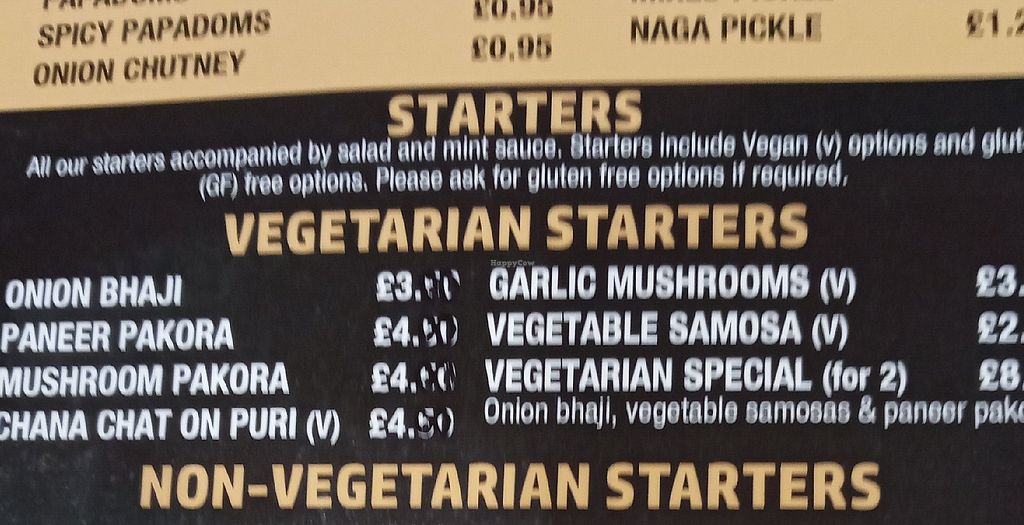 Serves meat, vegan options available. Restaurant serving Indian and Bangladeshi cuisine. Menu is clearly labeled. Example offerings include aloo gobi, jalfrezi, samosas and more. Dinner reservations encouraged. Open Mon 17:00-22:00, Wed-Thu 17:00-22:00, Fri-Sat 16:30-22:30, Sun 16:30-22:00. Closed Tue.