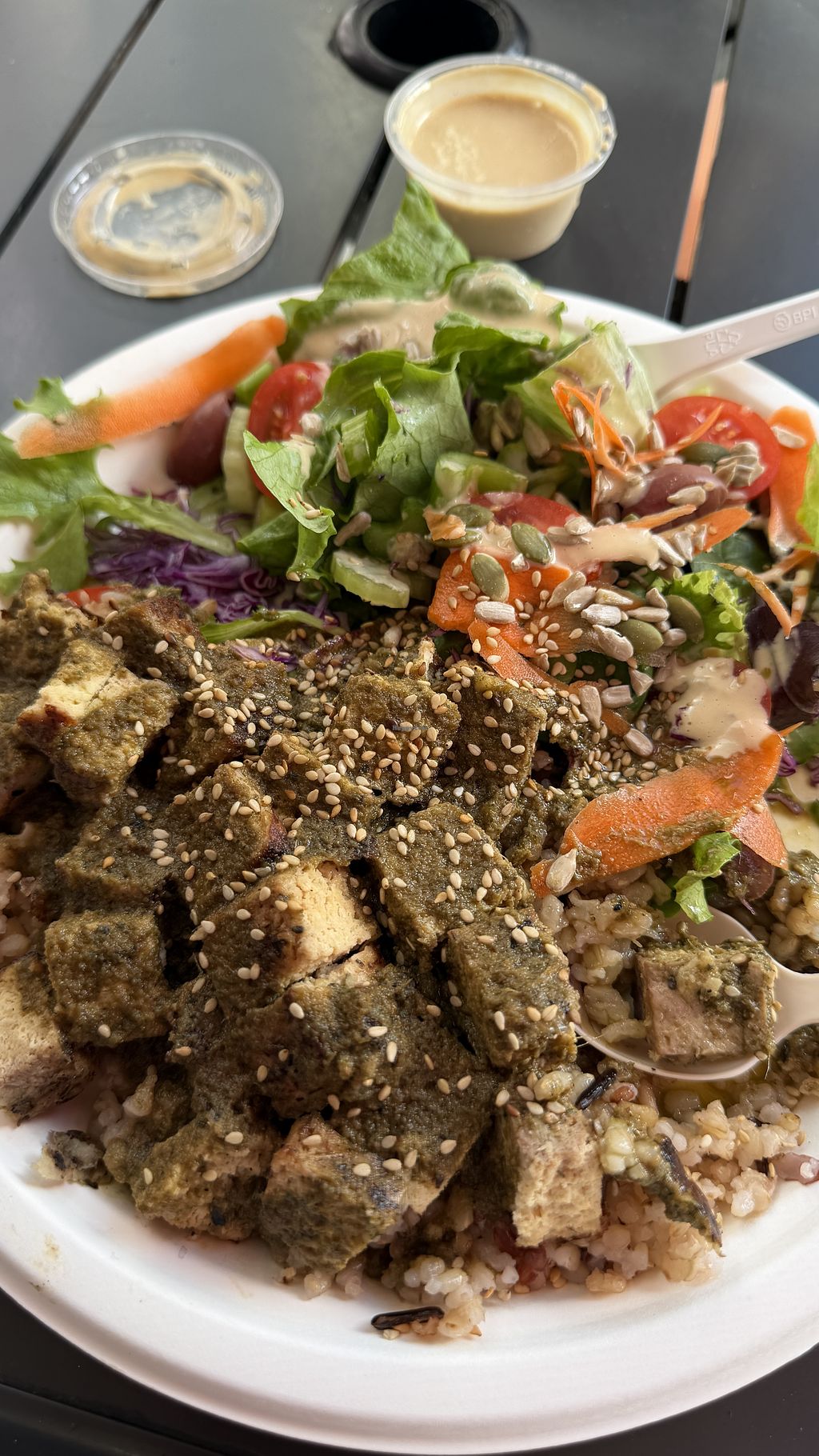 Pesto Rice & Tofu. Salad with Tahini dressing