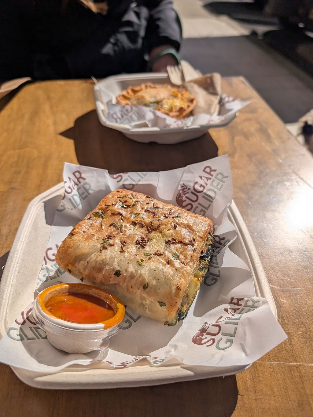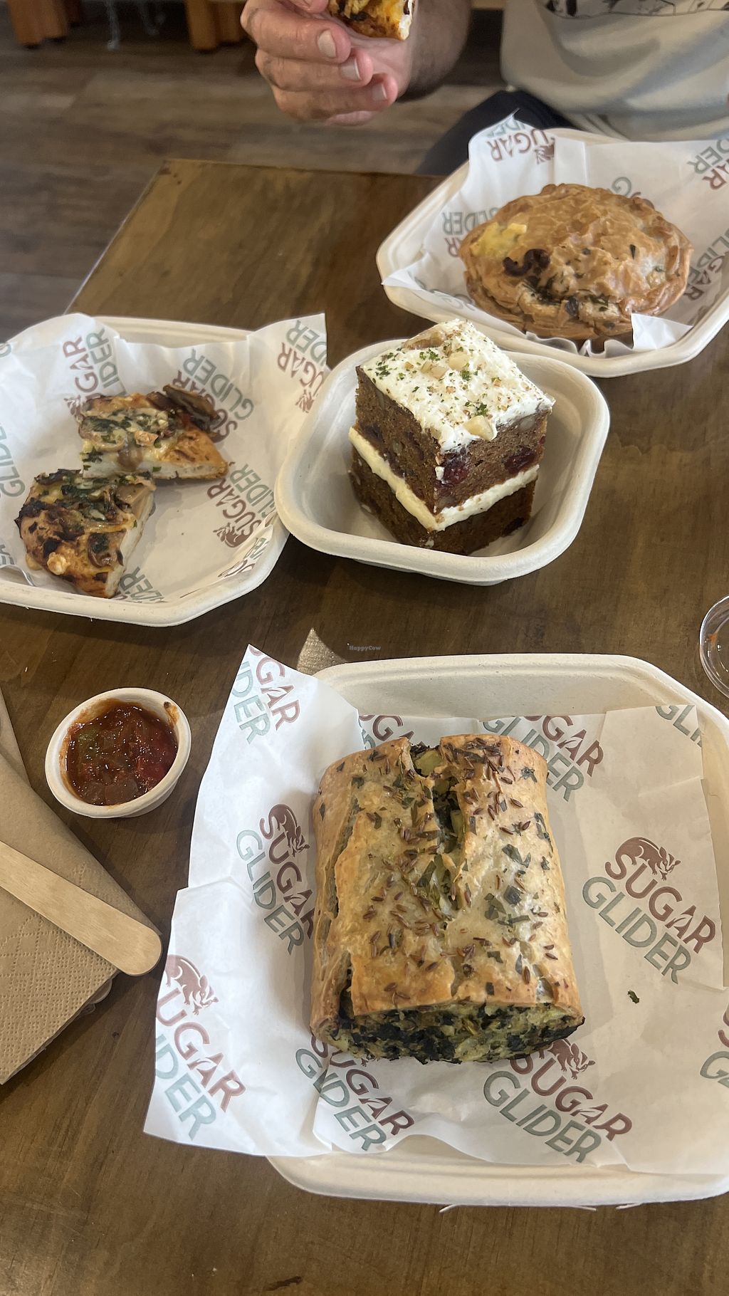 We discovered this place on our way west and we were delighted to find an all vegan cafe in this area! We ordered a mushroom pizza, spag bol pie, sausage roll, carrot cake and two coffees. It was all delicious!! Freshly made on the same day. We got some turmeric focaccia bread to go as well. Highly recommend!! Love what these guys are doing. Awesome stuff.