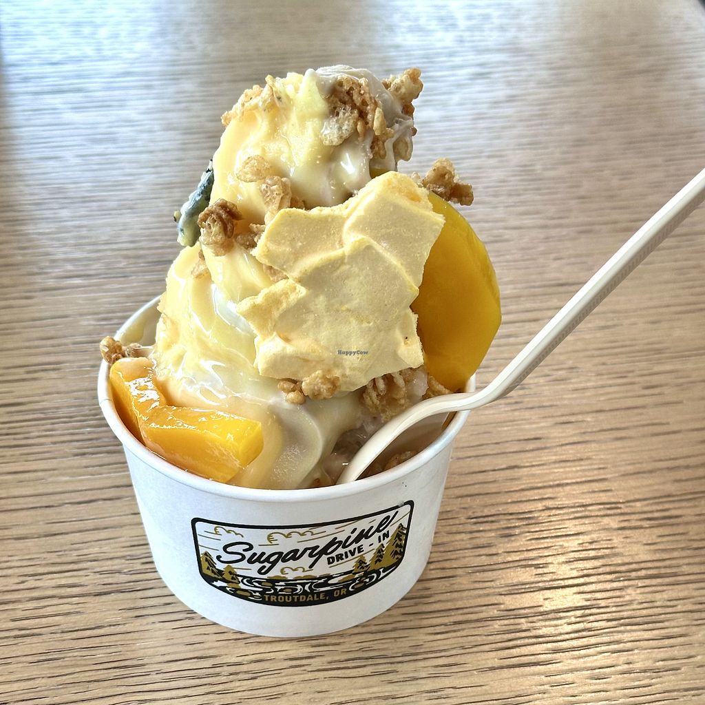 Passed through Troutdale just to eat at this place! Ordered the Caul’ of the Wild cauliflower burger a few weeks ago and I see it’s not on their menu today. They now have some different vegan items on offer. Looks like they change their menu with the seasons. Nice! The food was good and the staff great. The cauli burger also came with an option to have it as a rice bowl instead of in a bun which I kind of wish I would’ve done. A bit too bready with the cauliflower. My mom had the Sugarpine salad which she thoroughly enjoyed. But the dessert! Strawberry cheesecake sundae! Wow! It was a coconut based vanilla ice cream and strawberry sorbet combo covered with strawberry sauce and cashew cheesecake bites. Yes, please! So great to have a creative and delicious vegan dessert option at a drive in! Vegan items/options are clearly marked on their menu. A great stop for lunch!