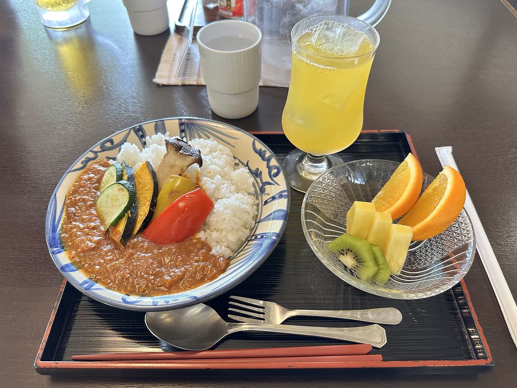 The vegan curry was good. Fresh vegetables and a passion fruit juice and a small bowl of fruits. Nice meal for our trip