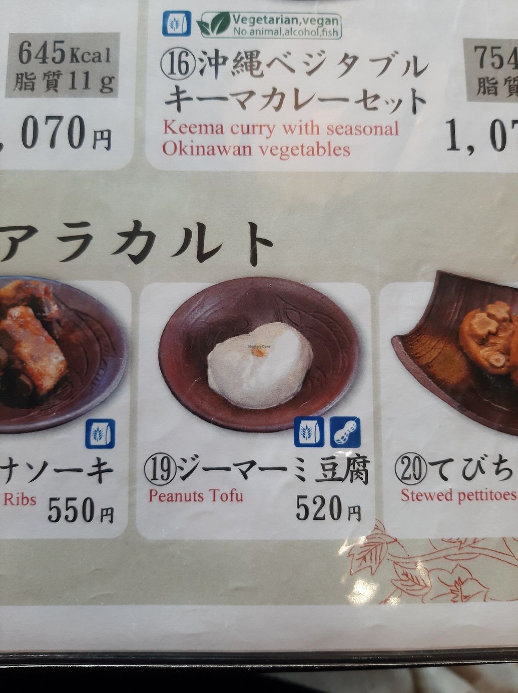 Serves meat, vegan options available. Restaurant located in Shurijo castle park, a popular tourist spot in Okinawa. Reported can provide for vegans a curry rice and mapo dofu. The restaurant is on the 3rd floor. Open Mon-Sun 10:00am-4:30pm.