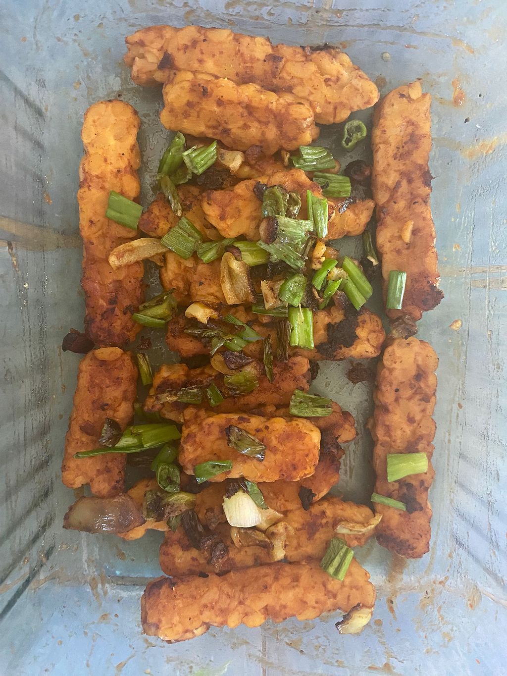 Bqq chickpea tempeh sprinkled with green pepper and green onion in a c…