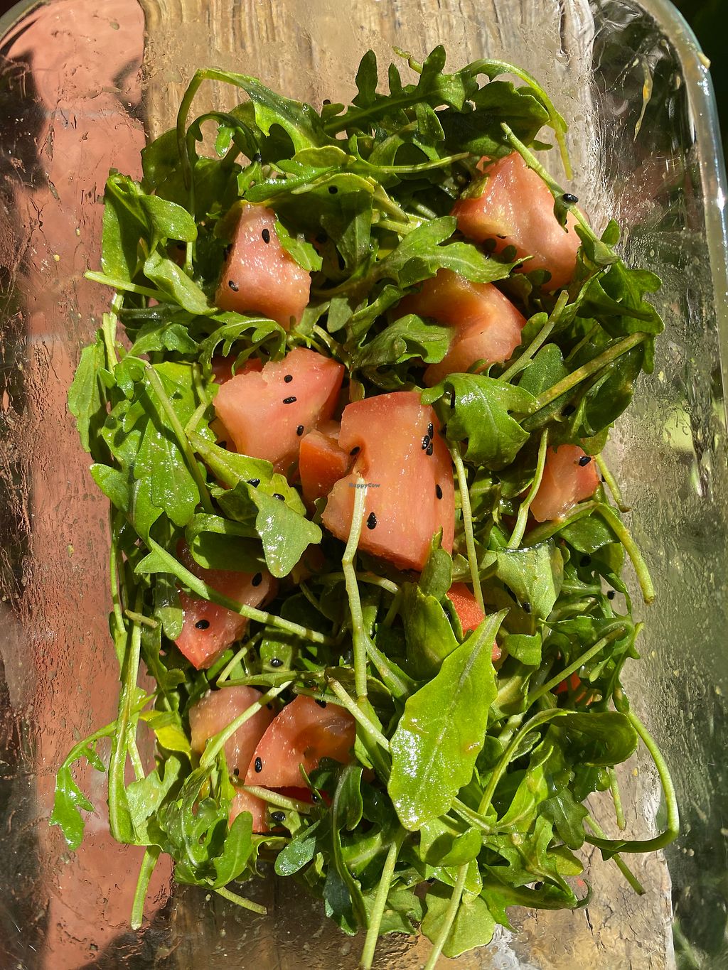 Arugula tomato salad with coconut almond ginger dressing and black ses…
